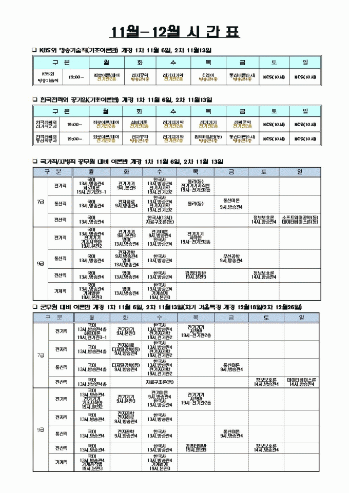 2026년 3월-4월 통신직,전기직 공기업시간표
