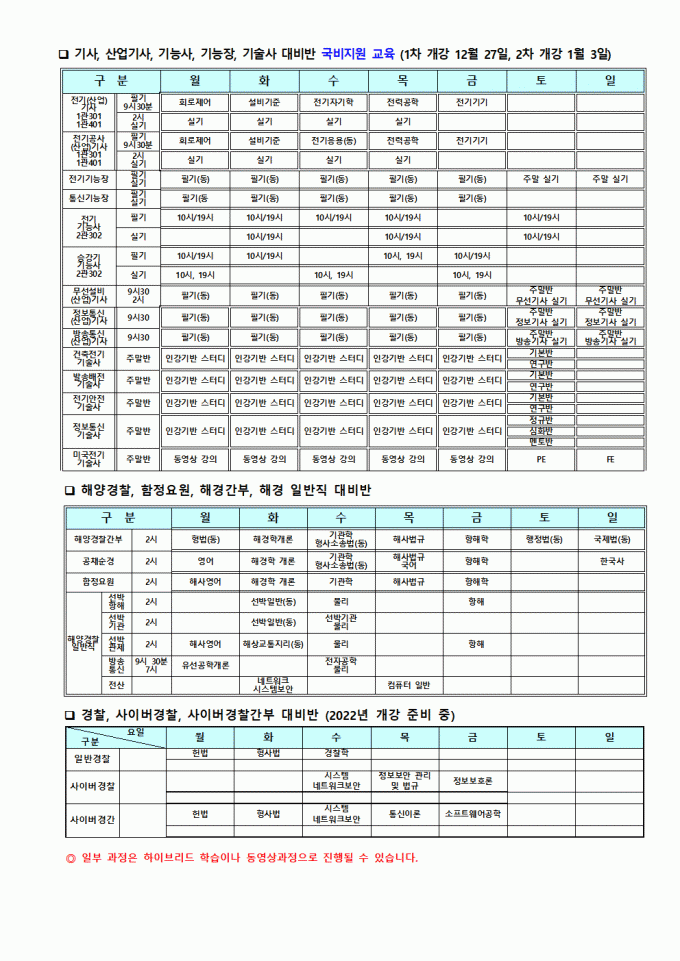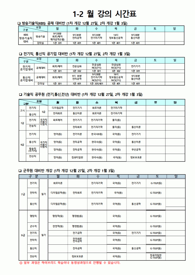 2022년 1~2월 강의 시간표
