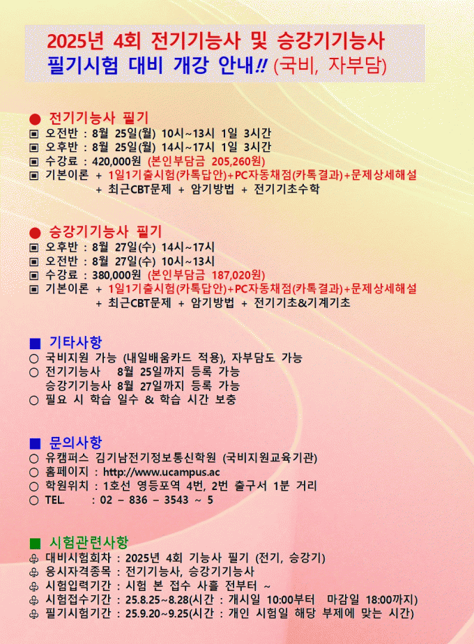 "국비지원" 25년 4회 전기기능사/승강기기능사 필기시험대비 상세안내(수정)