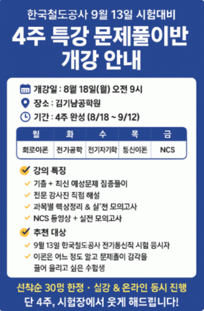 2025년 코레일 하반기 채용대비 아래와 같이 개강합니다. ▣ 개 강 : - 2025년 8월 18일(월), 09시 ▣ 채용인원 -차량전기 88명 - 전기전자 30명 -전기통신 188명 - 자격증 제한경쟁 전기통신 39명외 ▣ 개설강좌 - 차량전기직 -전기전자직 - 전기통신직 ▣ 공사 수강료 - 50만원(동영상 40만원) ▣ 문의전화 : 02-836-3543~5, WWW.Ucampus.ac