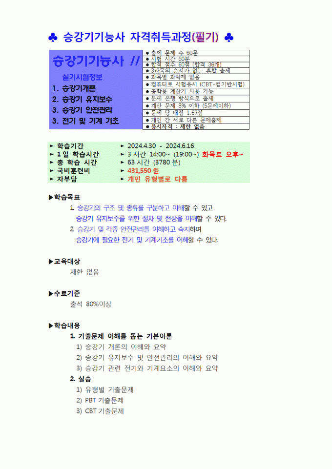 2024년 승강기기능사 2회실기 개강안내
