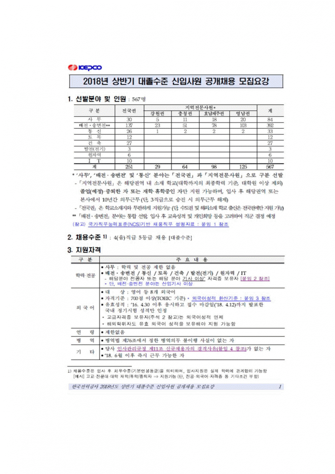 공기업ㆍ방송사 [채용공고] 2018년 한국전력공사 채용공고