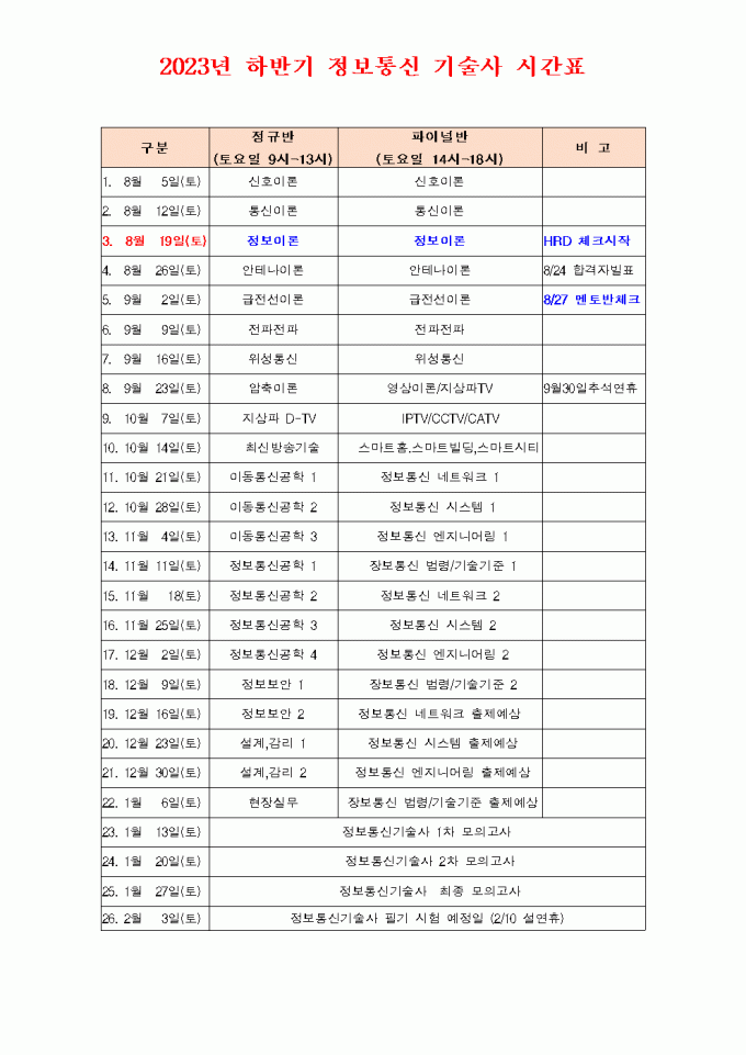 2023년 하반기 정보통신기술사(멘토반) 시간표!!!