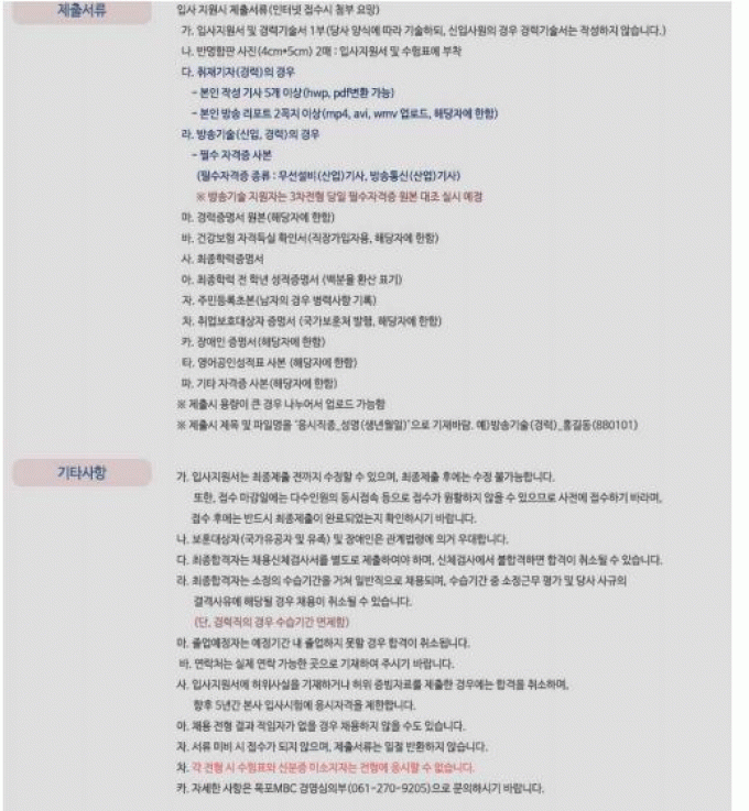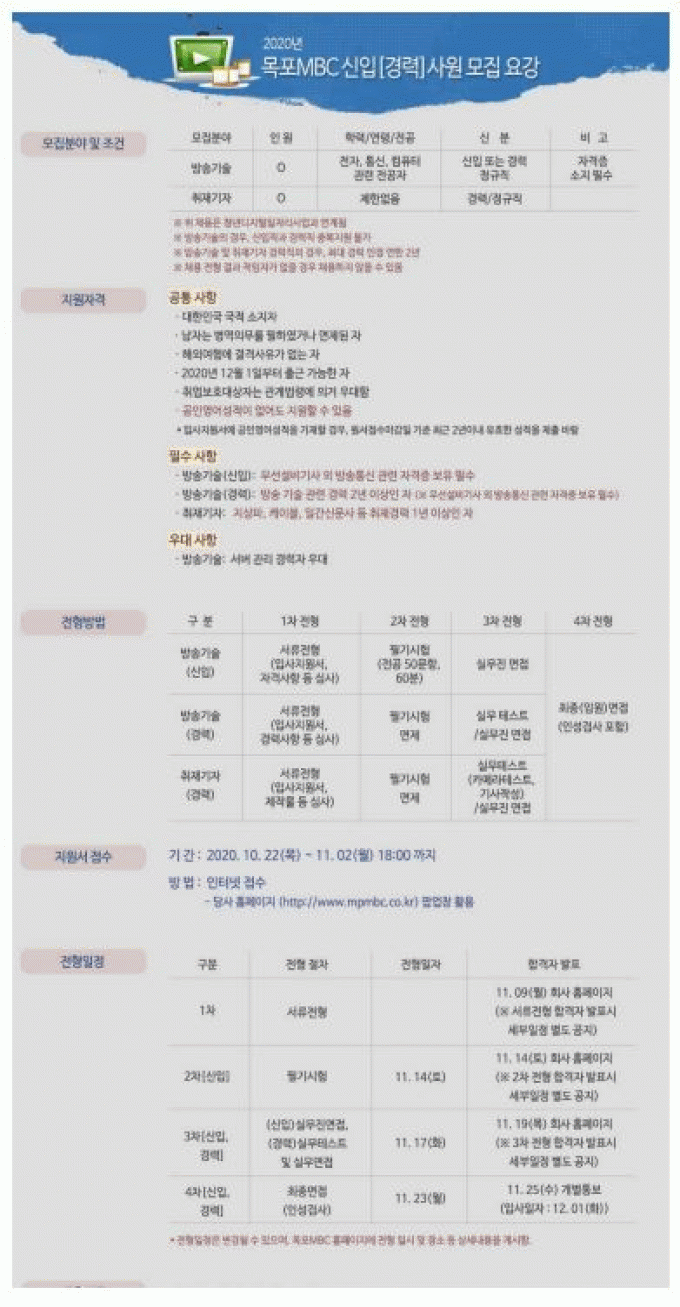 방송기술직 [채용공고] 2020년 목포 MBC신입(경력)채용 공고