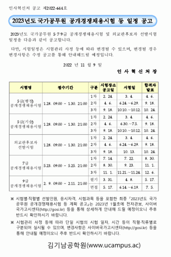 2023년 국가공무원 공개 채용시험 일정